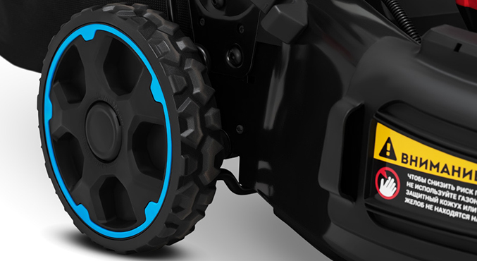 Колёса с двухрядными подшипниками обеспечивают легкость хода и длительный срок службы. Резиновые покрышки предохраняют газон от повреждений и обеспечивают тихий ход при транспортировке по твердым поверхностям.