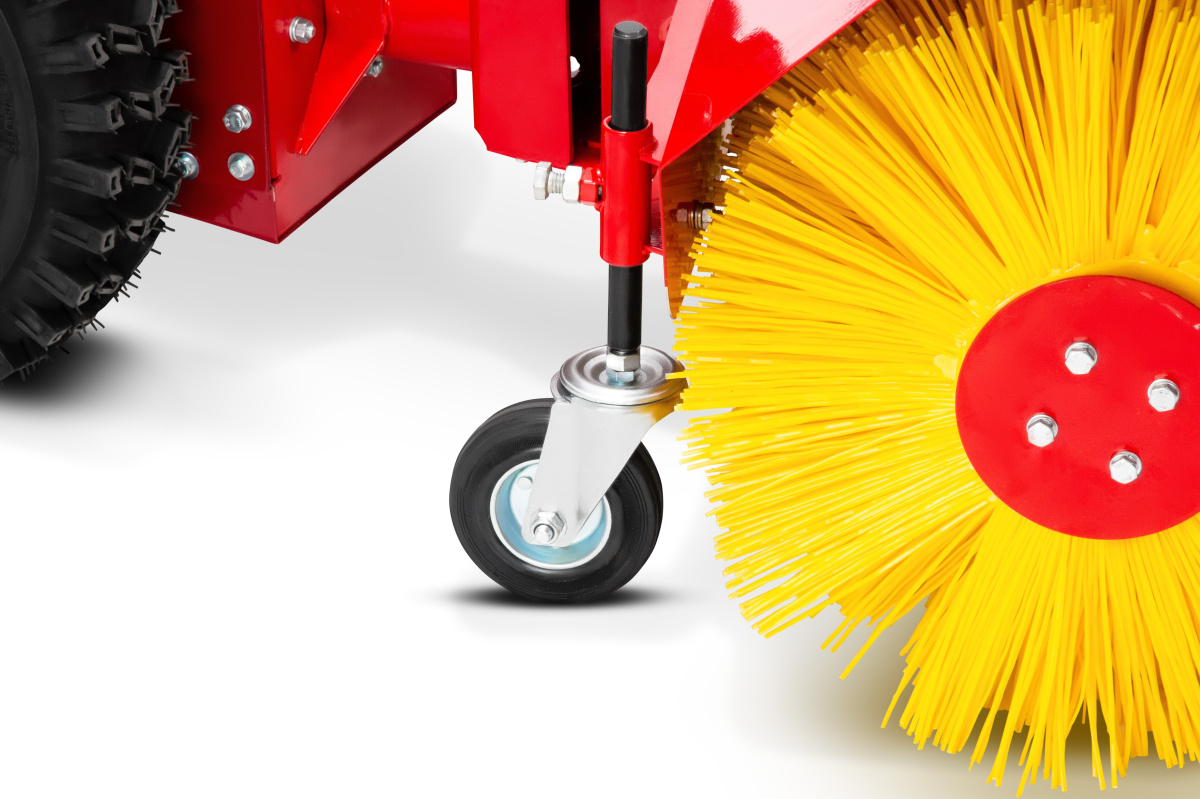 Благодаря специальным опорным колесам в конструкции управлять и поворачивать подметальной машиной легко и комфортно. Также при помощи этих колес можно отрегулировать уровень прижатия щетины к поверхности под разные типы загрязнений.